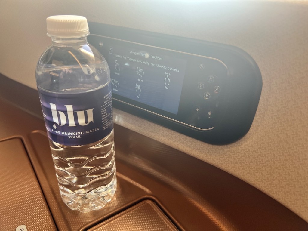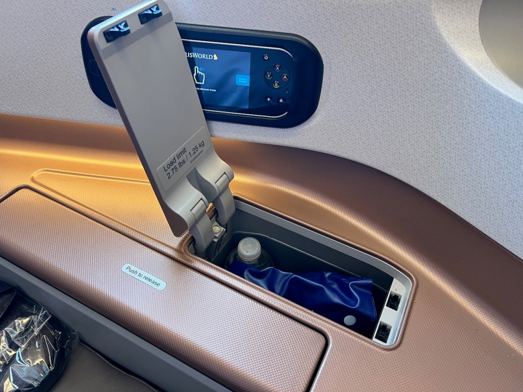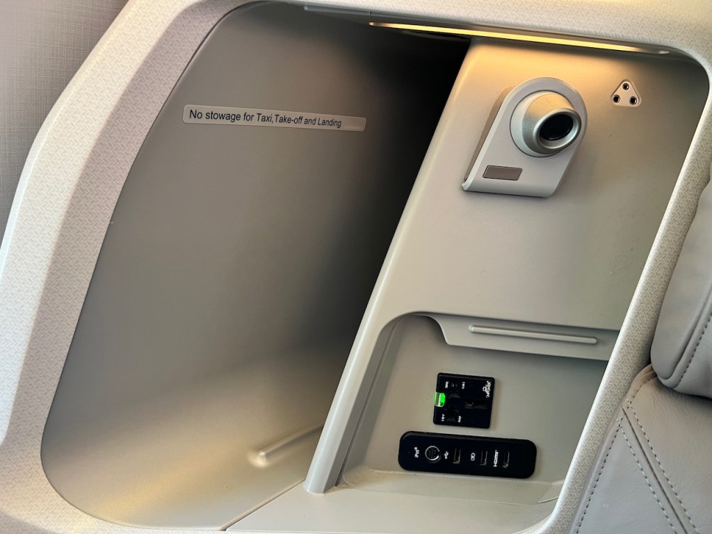 The wall of the business class seat offered the empower chargepoints. In a suite that’s now showing it’s age, once plugged in, there wasn’t anywhere to really park your devices or computers other than the map or magazine pocket next to you.