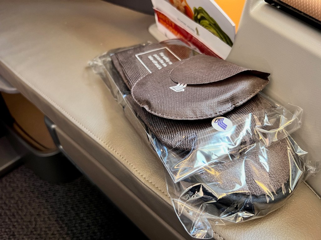 Waiting on the seat was the Singapore Airlines version of business travel necessities; a pair of slippers, a pair of socks and an eyeshade. These are distributed and provided to all passengers. Amenity kits are distributed “on request” for flights over six hours in length.