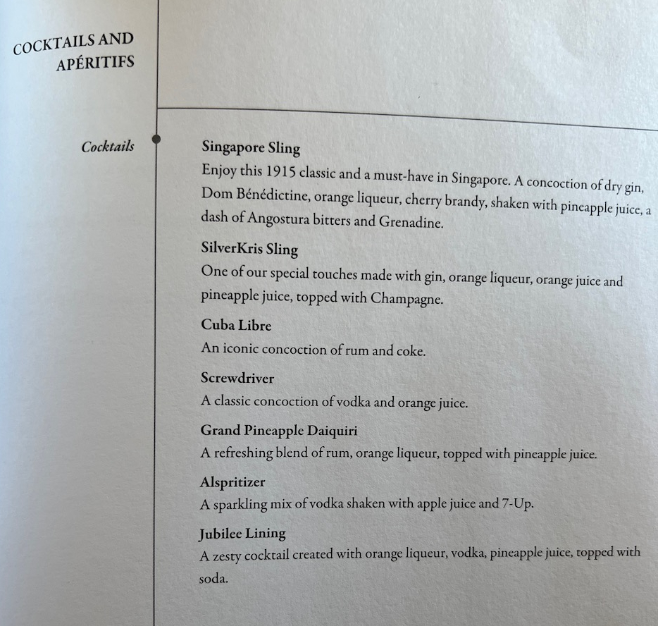 In addition to several choices of wine, there are a few pre-mixed cocktails available on board. These included the Singapore sling which in the SQ airline form was tasting pretty sweet for my taste buds these days.