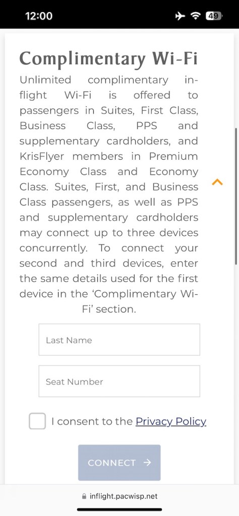 I was required to provide my surname and seat number in order to connect. While there is no data cap on usage, I did find the Internet connection to be quite spotty, dropping off at several times through the flight. Aside from basic texting, I wasn’t able to send photographs or conduct social media posts.