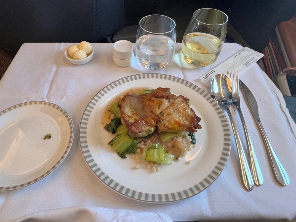 While Singapore Airlines offers a “Book the Cook” pre-order service in business class, I thought that the menu offering looked much more interesting. As a result my main course was the golden braised chicken thigh, served with organic couscous, Pak Choy and honey glazed cilantro. I was really satisfied with this dish; it was lightly savoury with just a hint of sweet glaze.