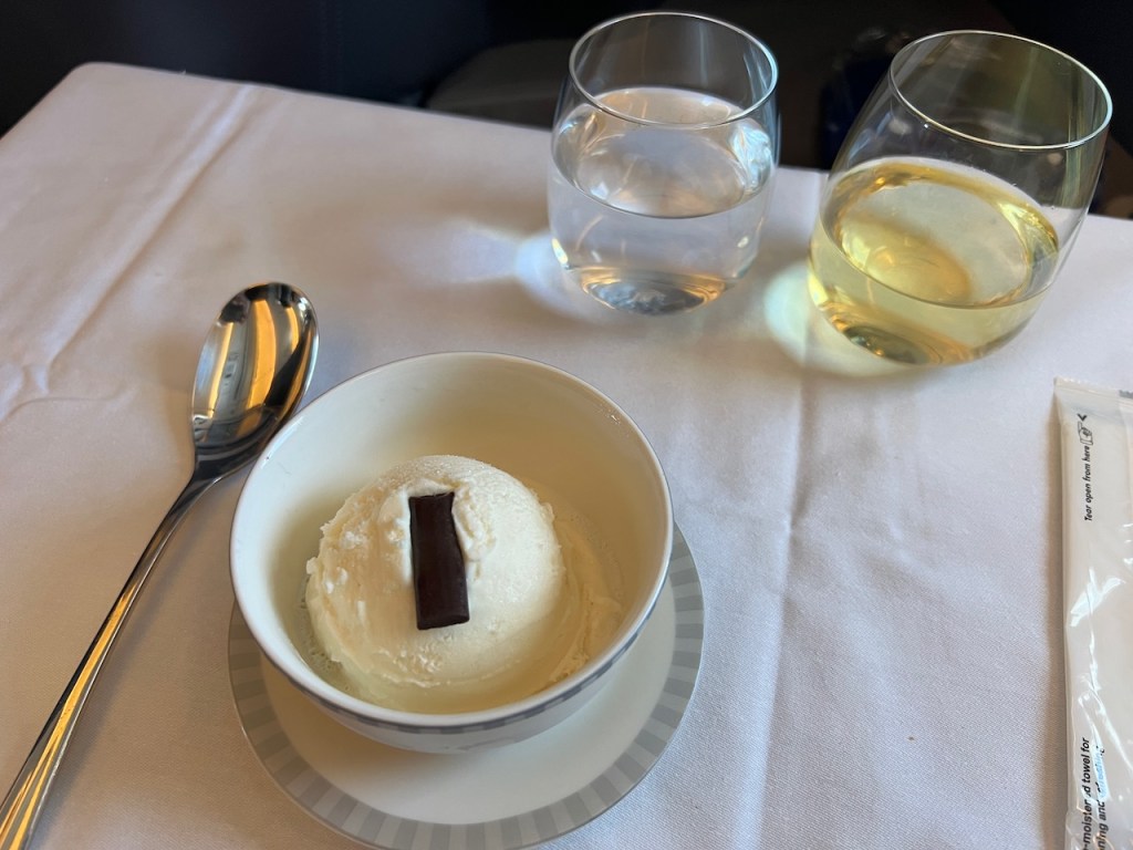 Never one to turn down ice cream for dessert, I concluded lunch with Häagen-Dazs vanilla ice cream. It was elegantly presented scooped into a plate with a chocolate slice, as opposed to just being served in an individual container. This was an upscale way to present ice cream. Coming down to the taste, the ice cream was exceptionally hard.