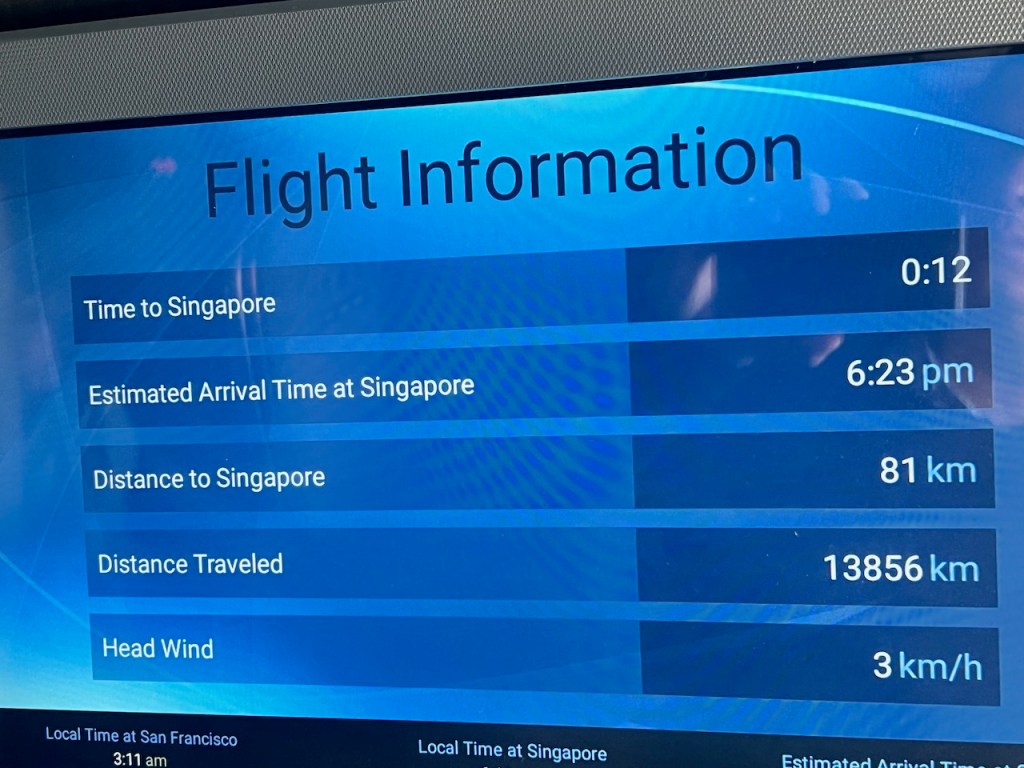 As our 15 1/2 hour flight wound down, the flight attendants started to prepare the cabin for landing. The captain came on the public address system addressing us as “”ladies and gentlemen boys and girls” with the announcement that we would be arriving into Singapore an hour ahead of schedule.