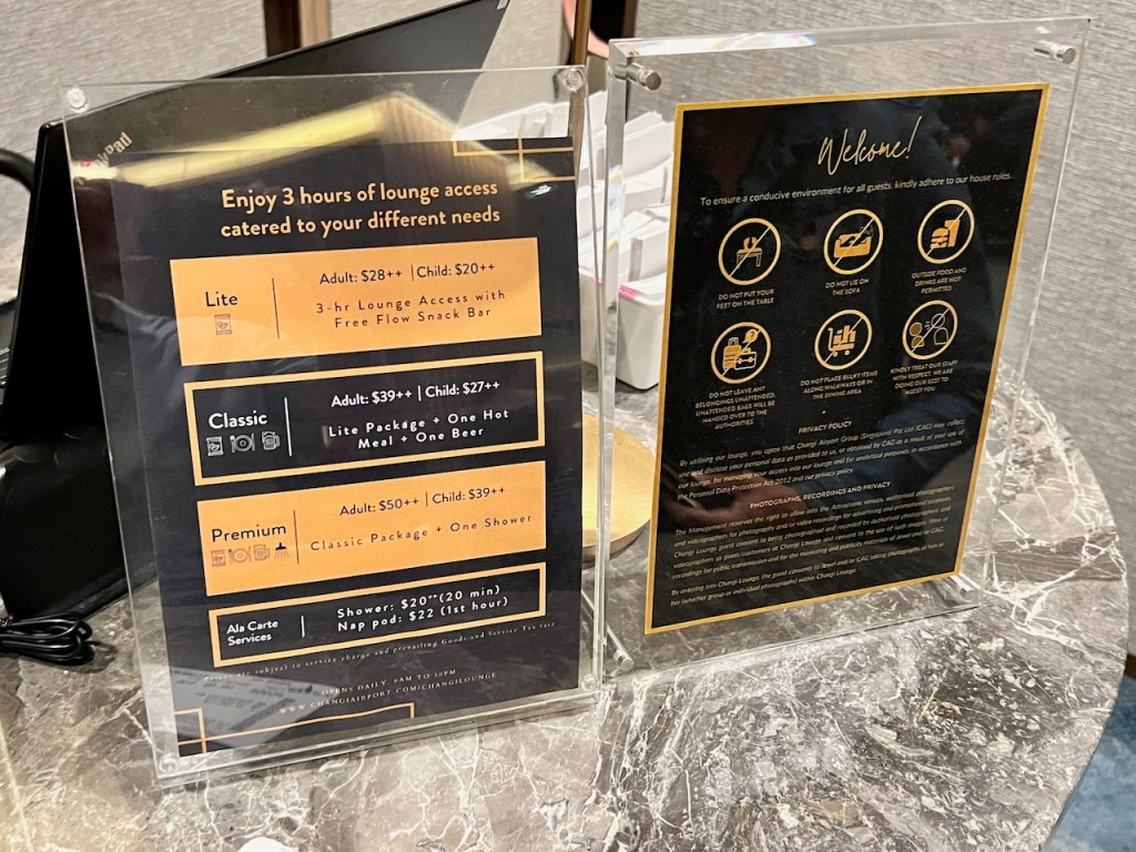 The Changi Lounge at The Jewel is a pay per use lounge with a tiered pricing system. During the time of our visit the lounge offer the following price points for entry:
