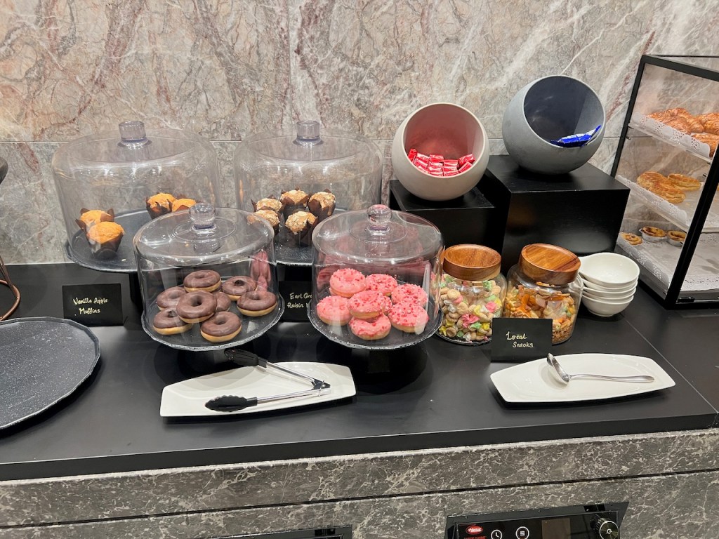 Instead, I went over to the food counter. There was a very minor amount of food available. There were some baked snacks including doughnuts, along with some salty crunchy snacks.