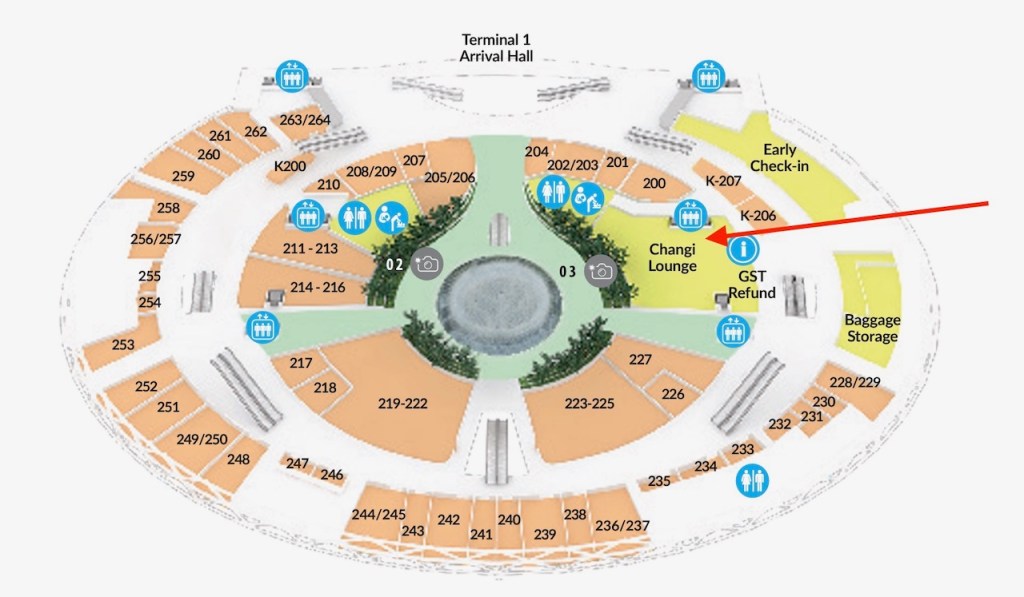 The Jewel Lounge is located a short walk from the arrival area of Singapore Changi Terminal One. The international arrivals zone in Changi Terminal One is just steps from the fountain at The Jewel.