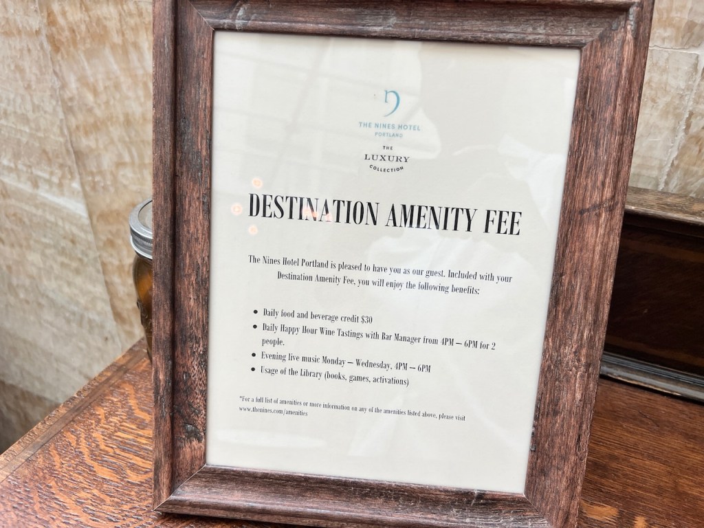 While I didn’t have to pay one during my visit, it seems that The Nines has recently instituted a Destination Amenity Fee (Resort Fee). I happened to notice these charts around The Living Room lobby bar, highlighting the mostly useless inclusions. The inclusions offered a $30 USD food and beverage credit, along with “live entertainment” and wine tastings during the evening hours only.