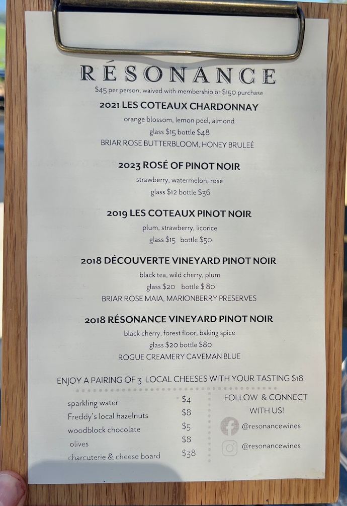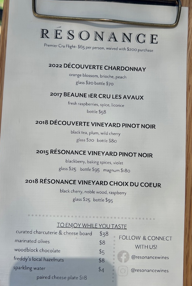 I ended up with the entry level tasting, which was an excellent introduction to Résonance Winery.