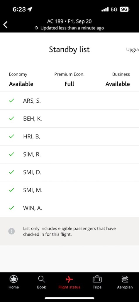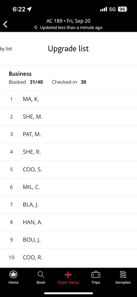After checking in through the Air Canada App, I was able to see the upgrade lists. The popular Toronto to Vancouver flight has gotten exceptionally hard to upgrade on with Air Canada E-Upgrade Instruments, unlike when I flew this route during the pandemic. Today, there are often 15 or more persons waiting for an e-upgrade; competing for a single digit handful of seats.