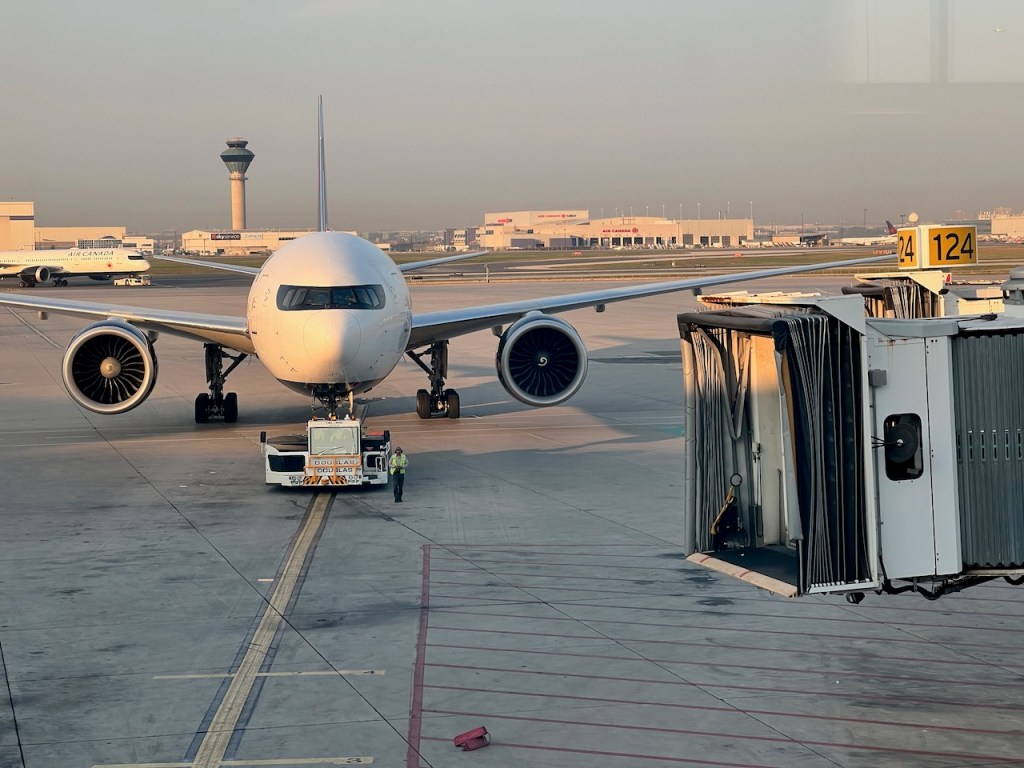 We had a gate announcement that the assigned aircraft had gone mechanical. Air Canada was in the process of towing over another substitute Boeing 777-300 ER to our gate 128. Given that Toronto Pearson is such a spread out airport, this took a little time to get the aircraft towed up to the gate.