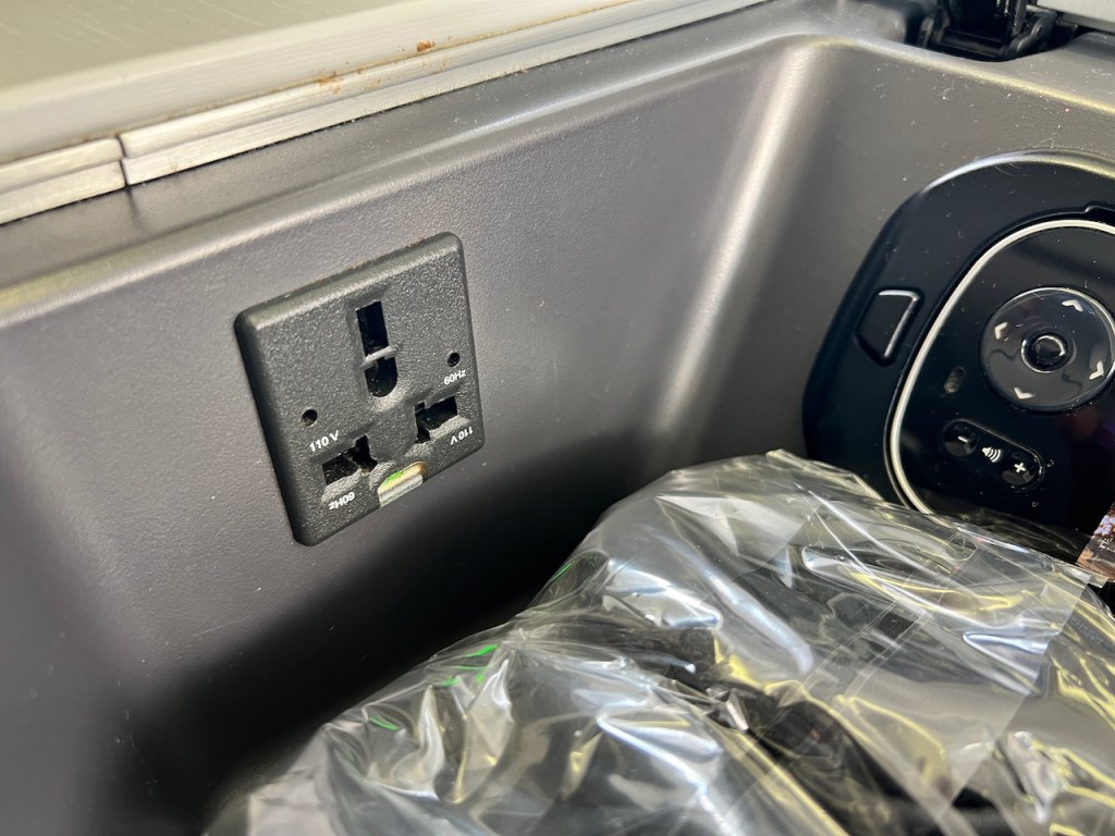 The Air Canada Business Class cabin seat offers a compartment for storage and charging of devices. The compartment also contains a wired remote which can control the in flight entertainment system.