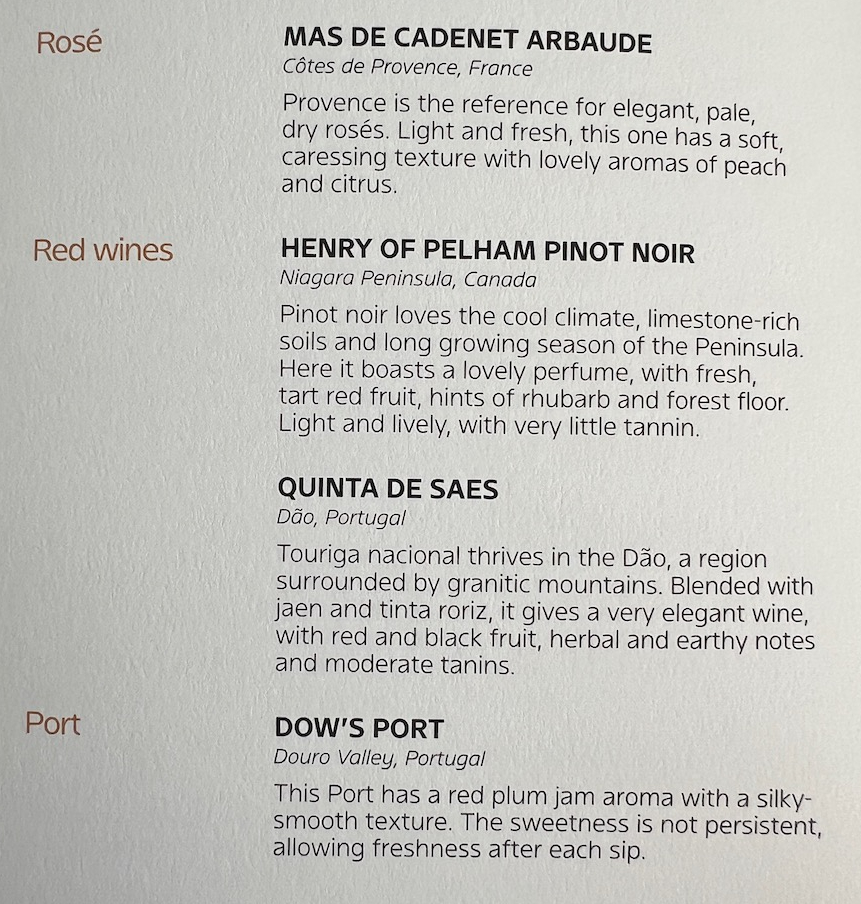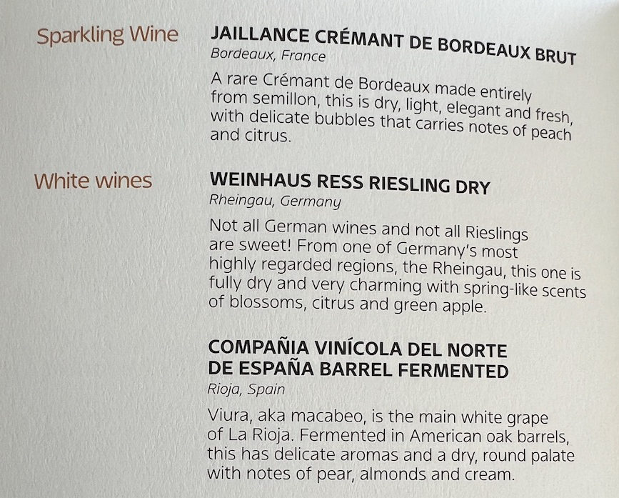 The breakfast menu also featured a number of Signature Class domestic wines. While there was no champagne on offer, there was a Crémant de Bordeaux Brut made entirely from Semillon which looked appealing. The whites consisted of Riesling from Germany and Rioja from Spain.