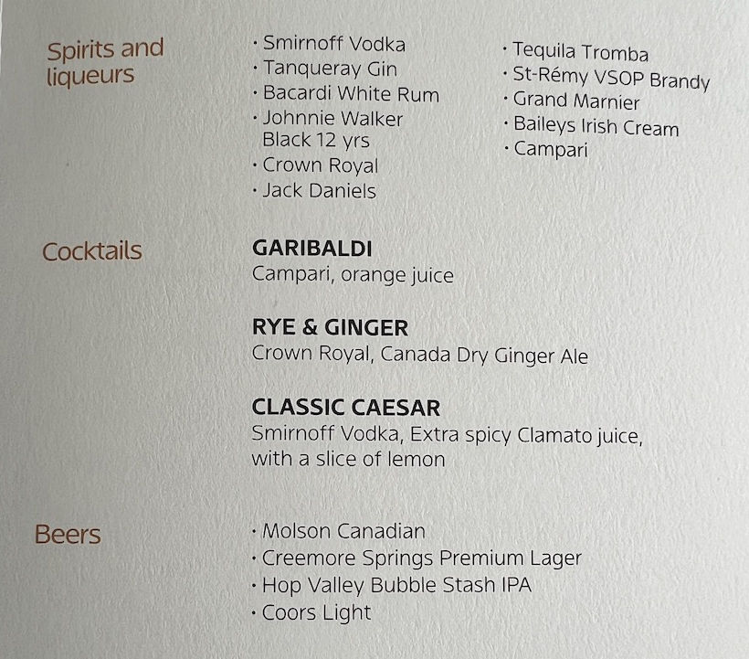 The Air Canada Signature Class menu also offered a number of spirits. For the first time, there were a few very simple cocktails listed on the menu. This was rounded out with the usual soft drinks and juices. There was also a list of snack basket items.