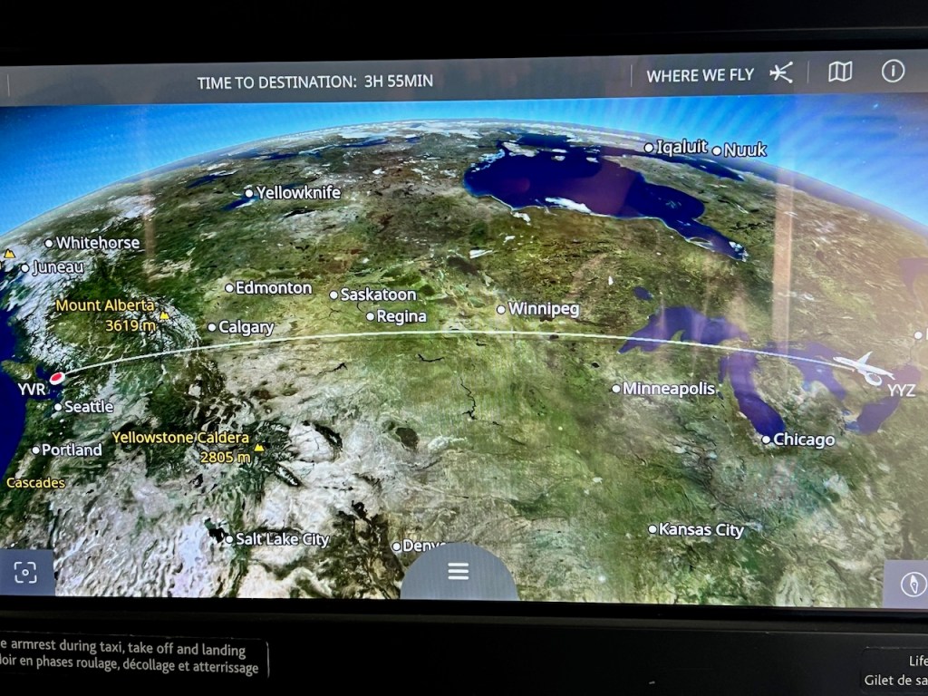 During the climb, I fiddled with the in flight entertainment system. I located the flight map, which had us on a straightforward track across Canada.