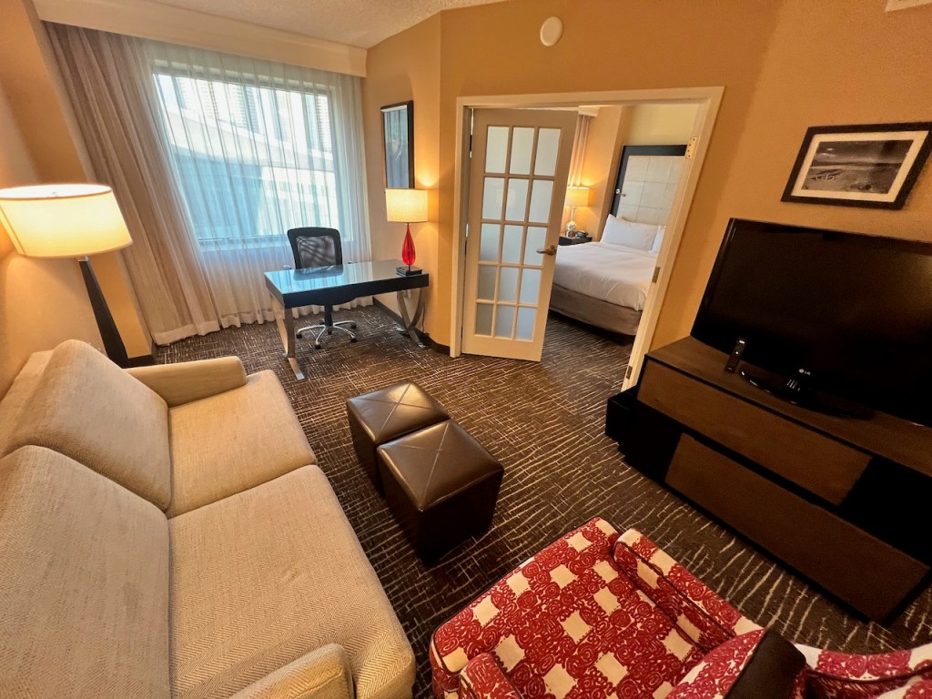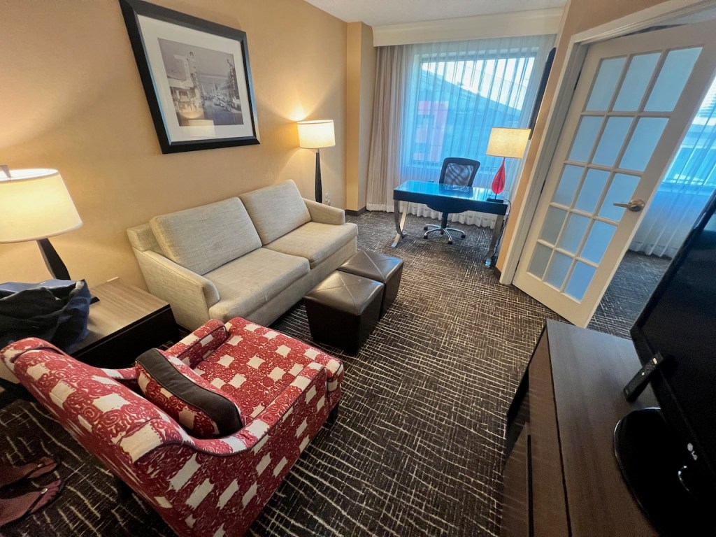 The King Suite at the Las Vegas Marriott is a compact suite that is 380 sq feet or 34 sq meters. The room features a small living space that offered a sofa bed, two small occasional tables disguised as stools, and a red occasional chair that could only belong to a Marriott hotel.
