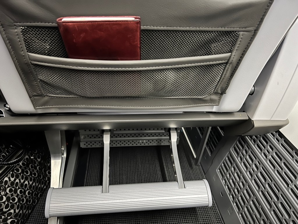 We settled into our seats in 2D and 2F. The seat consoles and seat pockets have been re-designed and are more modern. Each seat now offers a sturdy retractable foot rest, that seems to be fairing well on Air Canada’s First Class Max 8 product.