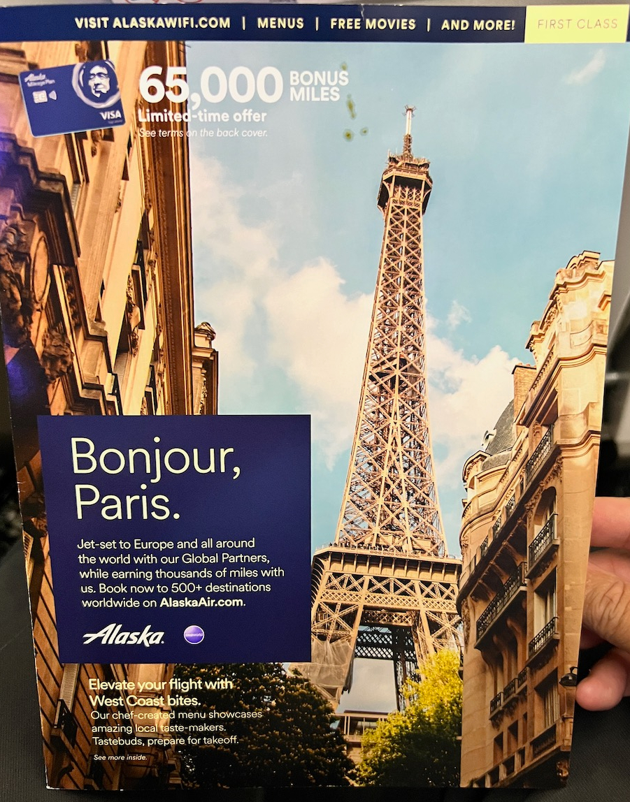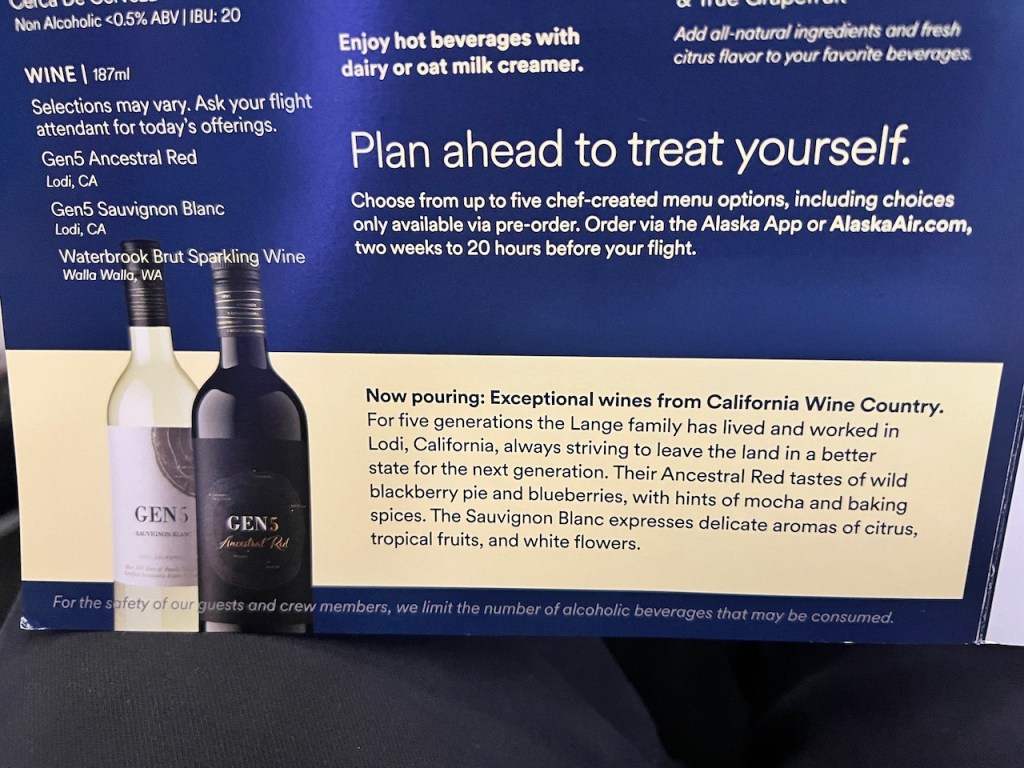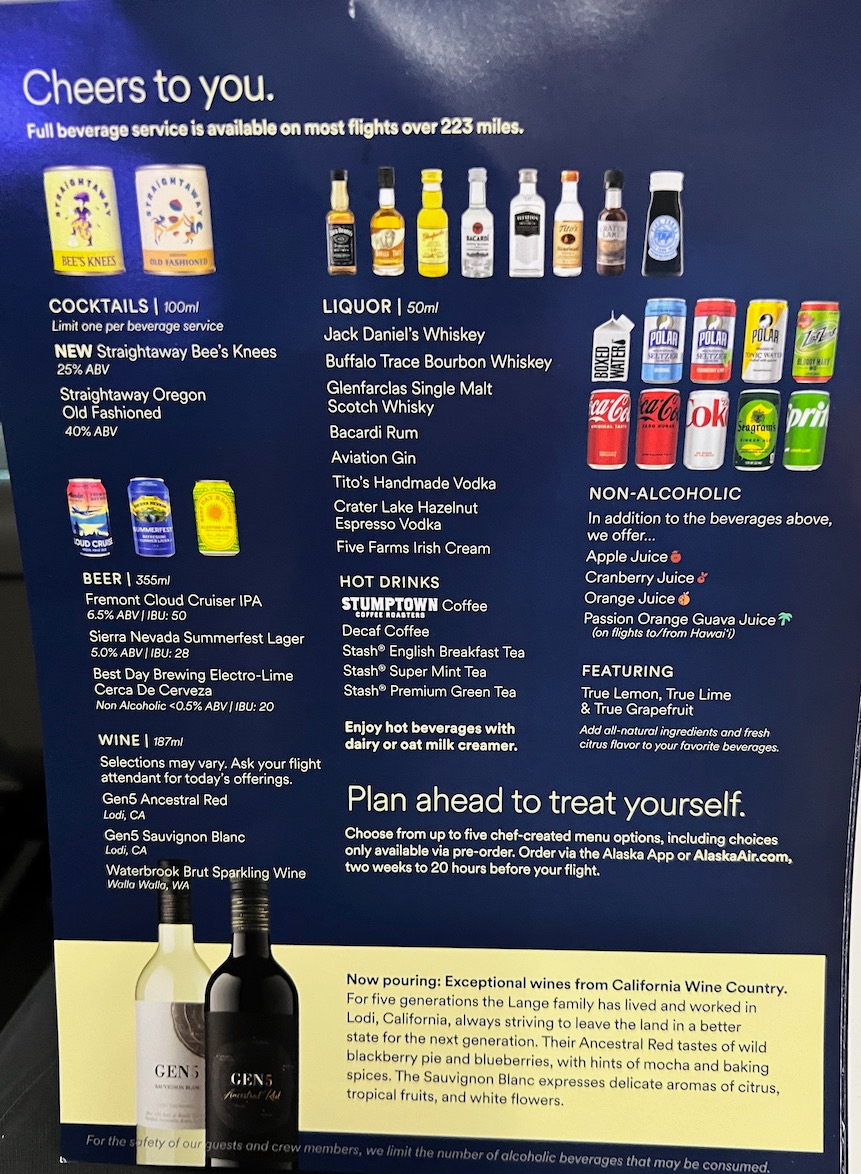 Alaska Airlines also offered an inseat back pocket menu that outlined all the drinks and wines on offer.