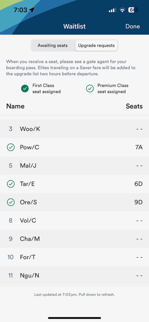 While we were waiting for the flight to board, I checked the upgrade list on the Alaska Airlines app. Alaska Airlines does pro-actively upgrade its Mileage Plan elites in advance, and we had cleared the upgrade list into First Class based on MVP Gold status. Despite this, there were an additional 11 on the upgrade list with some having cleared into a premium class cabin.