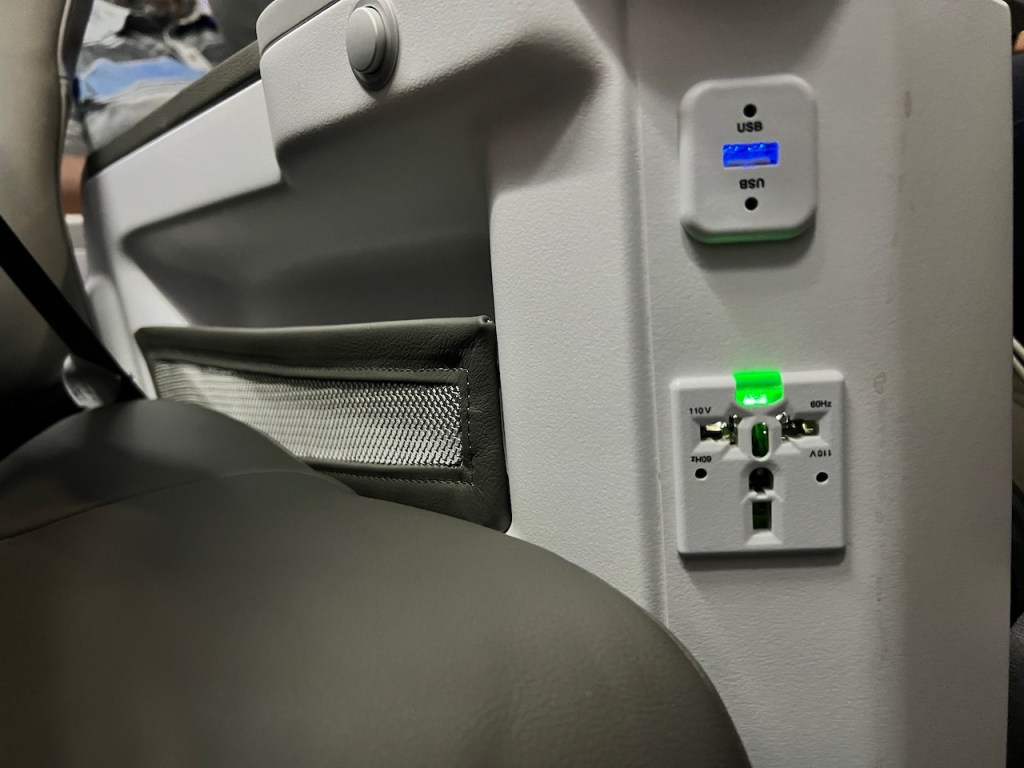 The new Alaska Airlines First Class seat offers in seat Empower with USB – B charging. The plugs are more conveniently located on angles facing the travellers. This is marked improvement from the old power plugs that were facing outwards at the bottom of the centre console, and otherwise harder to see from the passenger seat.