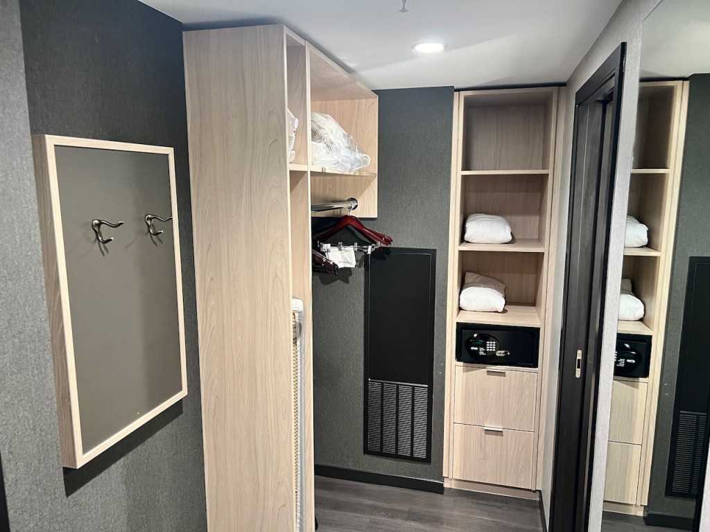The hotel room foyer offered a small coat room area. The space was highly functional with coat hooks appropriate for Calgary’s cool winter weather, an open closet area along with bathrobes and room safes.
