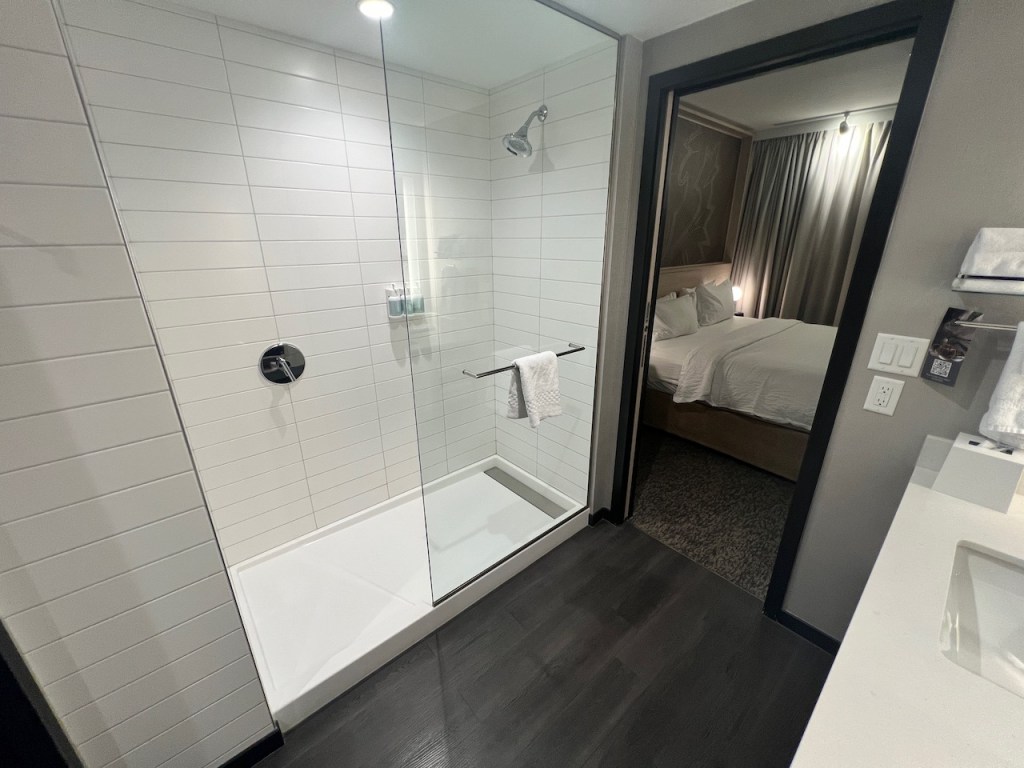 In a somewhat unusual and non functional manner, the hotel did not install any additional shelving in the shower. For road warriors like myself, this meant placing toiletries on the floor of the shower or balancing them on the soap dispensers.