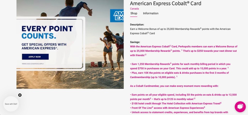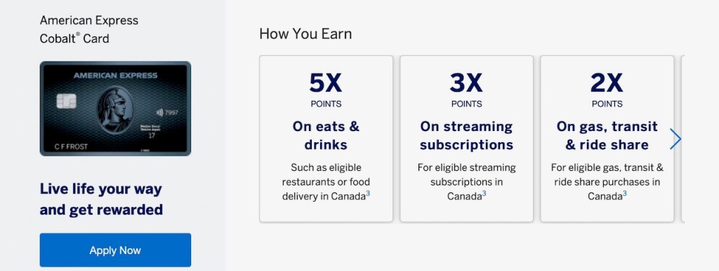The website offered terms and conditions of the American Express Cobalt 5X eats and drinks earning offer, 3X on eligible streaming services and 2X at stand alone gas stations, local commuter transportation in Canada including street car, subway and taxi. limousine and ride sharing. It’s clear that the terms and conditions would require a little study on the card holder’s part if you were looking to maximize the benefits.