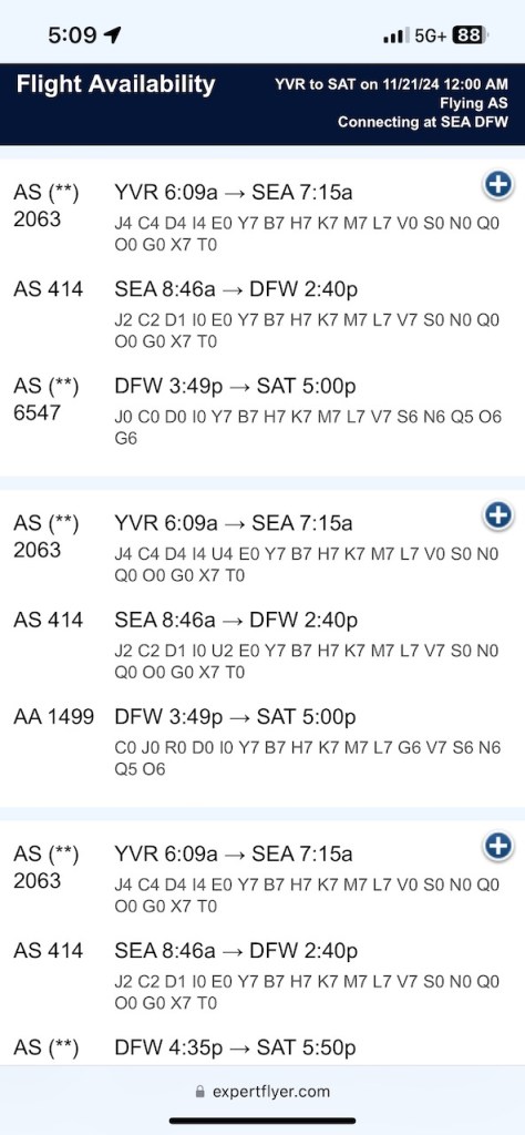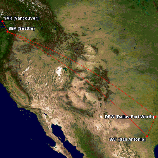 I ended up picking the cheapest route, which took me through Dallas Forth Worth on the way down. I was lucky enough to get the Alaska Airlines non stop San Antonio – Seattle on the way back.