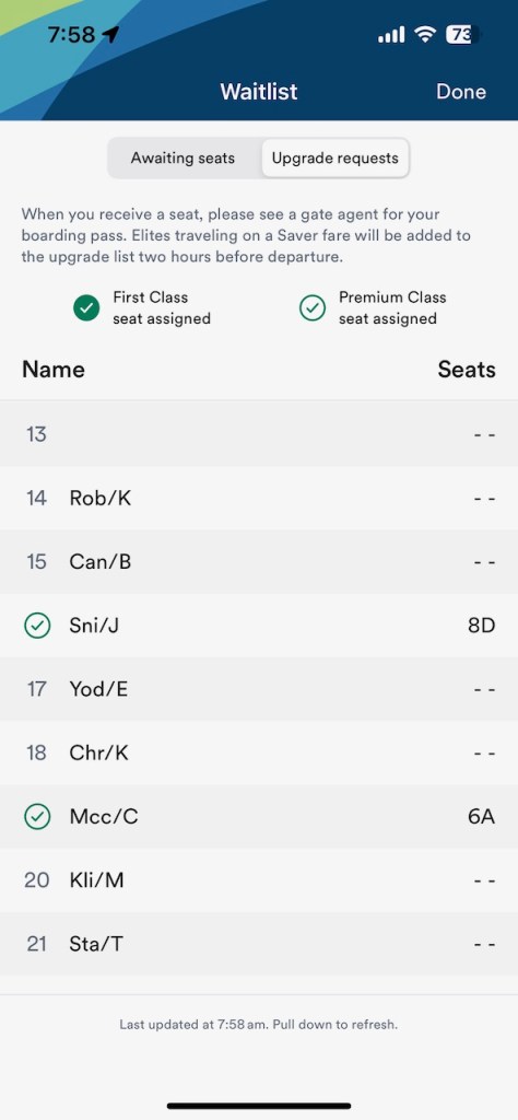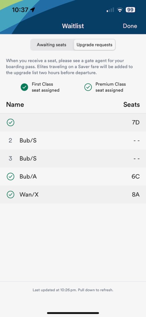 I didn’t get any Alaska Airlines Mileage Plan MVP upgrade love on the way back either. With only two first class seats open when the flight closed, I ended up being first on the upgrade list getting assigned into Alaska Airlines Premium Class for the longer San Antonio – Seattle leg.