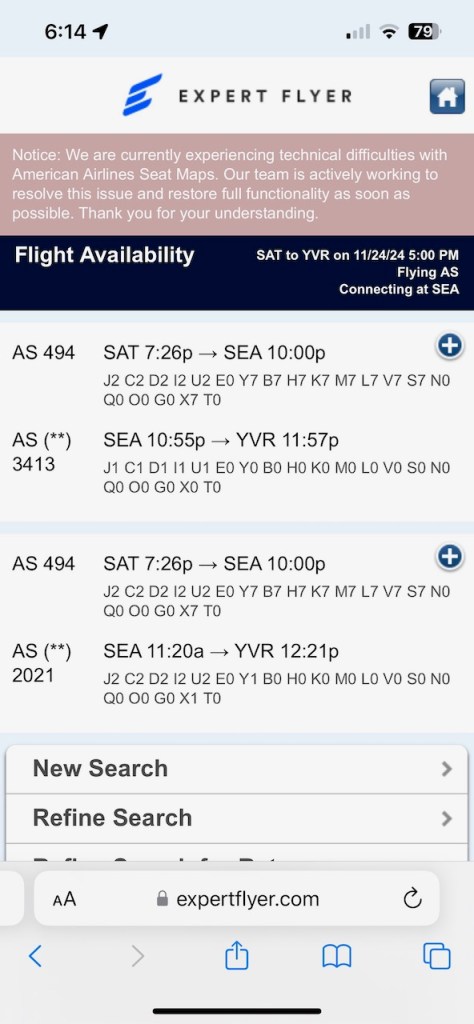 When I booked, the price point for most fares were identical on United Airlines, American Airlines and Alaska Airlines. Since I’ve been collecting miles in both Air Canada’s Aeroplan and Alaska Airlines Mileage Plan, I ended up purchasing an Alaska Airlines fare since they all earned 100% Elite Qualifying Miles. Most United Airlies fares in economy class earned only 50% Elite Qualifying Miles.