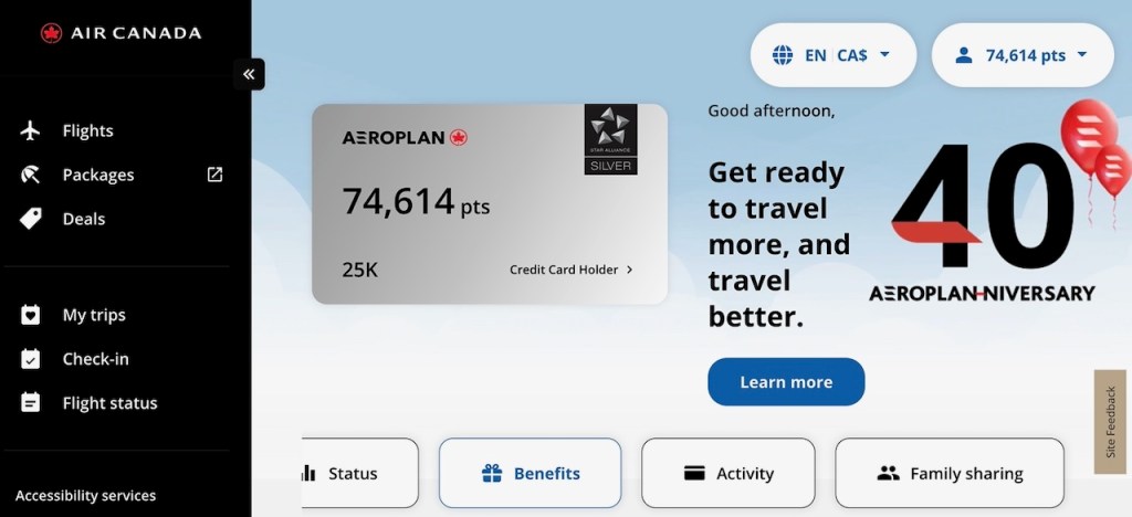 The Air Canada Aeroplan Elite Select benefit selection is located well inside the Air Canada Aeroplan app. I usually just navigate to the Air Canada webpage, and follow the sign in process.
