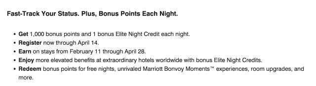 Earn 1,000 Marriott Bonvoy Points per Night and 1 Bonus Elite Night Credit Each Night.