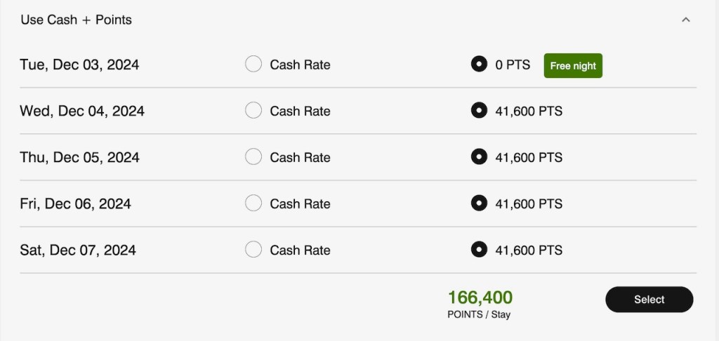 For the next longer stay reservation I ended up redeeming 166,400 Marriott Bonvoy points for five nights. Marriott Bonvoy members get the fifth night free when redeeming four nights. This brought down the average nights stay to 33,280 Marriott Bonvoy points, which was an excellent deal.