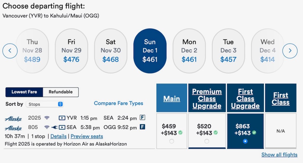 On the Alaska Airlines website booking page, if you toggle the Alaska MVP mileage plan level and look for a blue and white F in the fair types, you’ll be able to purchase and instantly upgradeable first class fare. With a little guess and check, we were able to locate upgradable space to Hawaii, USA that aligned with our great rate hotel stay.