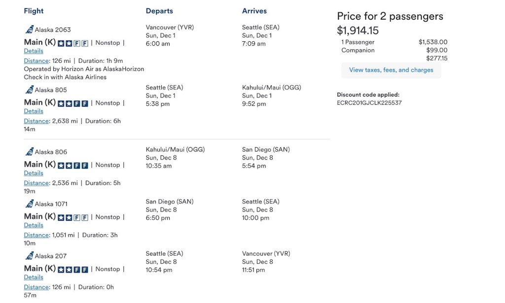 I had access to one last Alaska Airlines Companion fare, courtesy of the now defunct Alaska Alaska Airlines MBNA Mastercard. If you’re reading from the United States, this Companion Fare remains available with the Alaska Airlines Visa Card offered by Bank of America. These fares allow for a second companion fare to be purchased for just $99, plus taxes and fees.