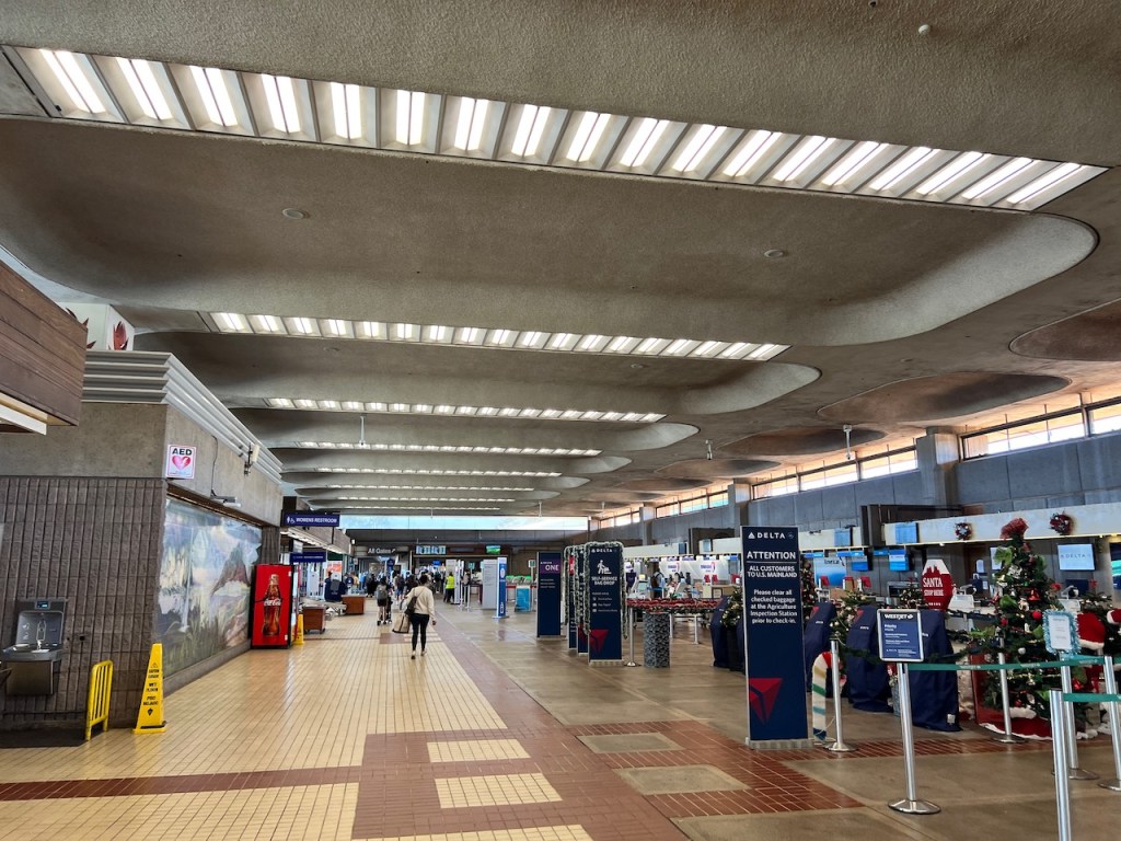 While there have been some infrastructure improvements at the Maui International Airport, the check in areas are pretty much the same. The architectural experience is of brutalist design that is also functional in nature.