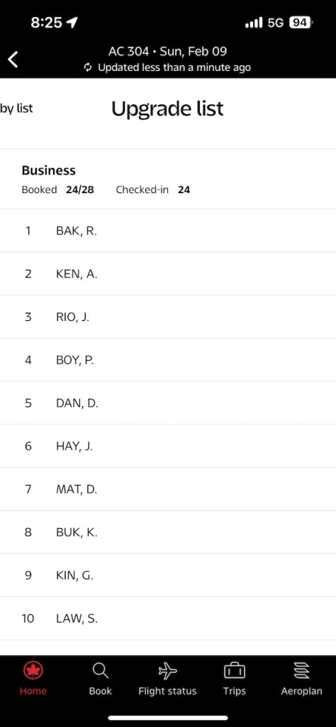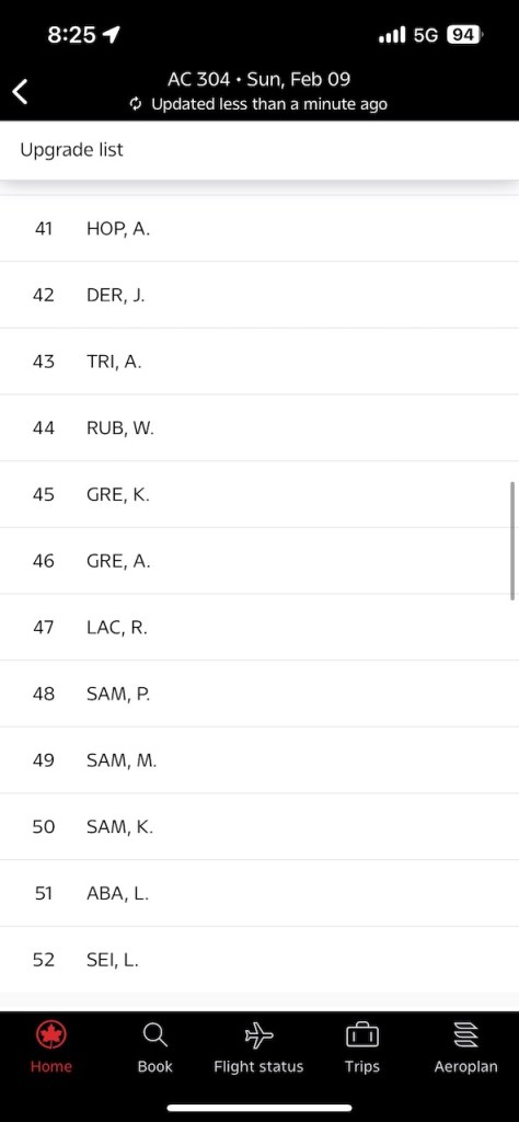 While I was waiting to board, I took the time to go into the Air Canada app to check the upgrade list. On today’s flight they were over 50 people waiting to upgrade to premium economy or business class. With this many people waiting to upgrade, it makes the Air Canada E upgrade credits a lot less useful than they used to be for trans continental flights.
