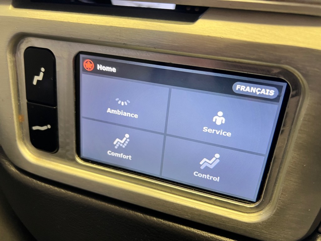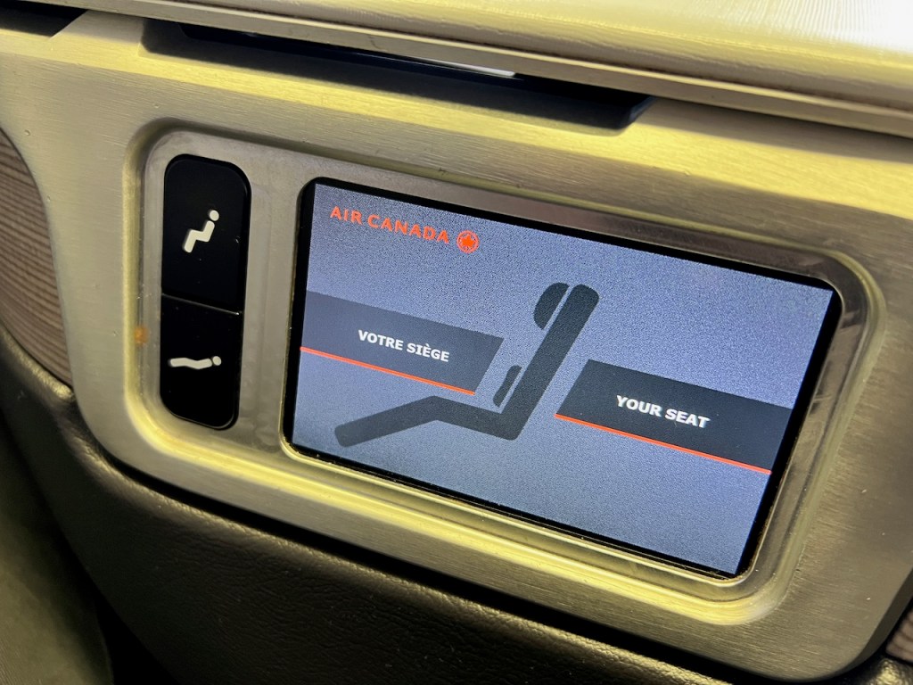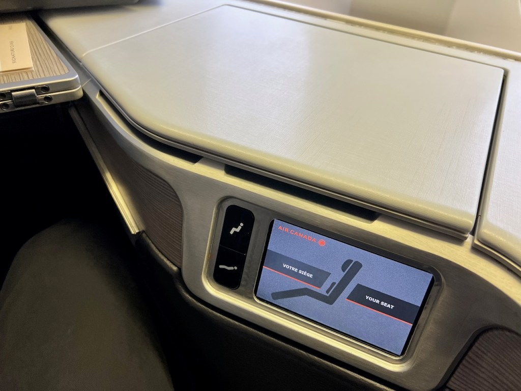 The Air Canada Signature Business class seat offers a small compartment that is perfect for charging phones, storing wallets along with anything else. It’s located under the counter immediately above the seat controls.