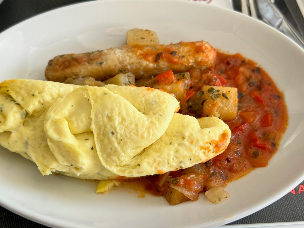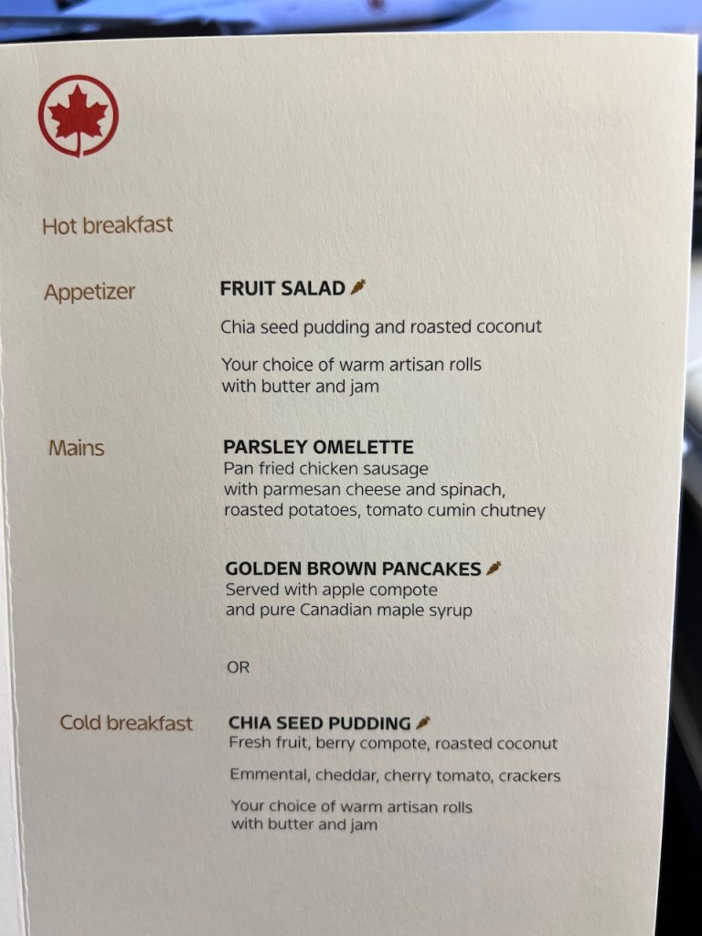 The Air Canada breakfast offerings have been pretty static for quite some time. The choices come down to the usual parsley omelet or meatless pancakes. I ended up going with the usual parsley omelet.