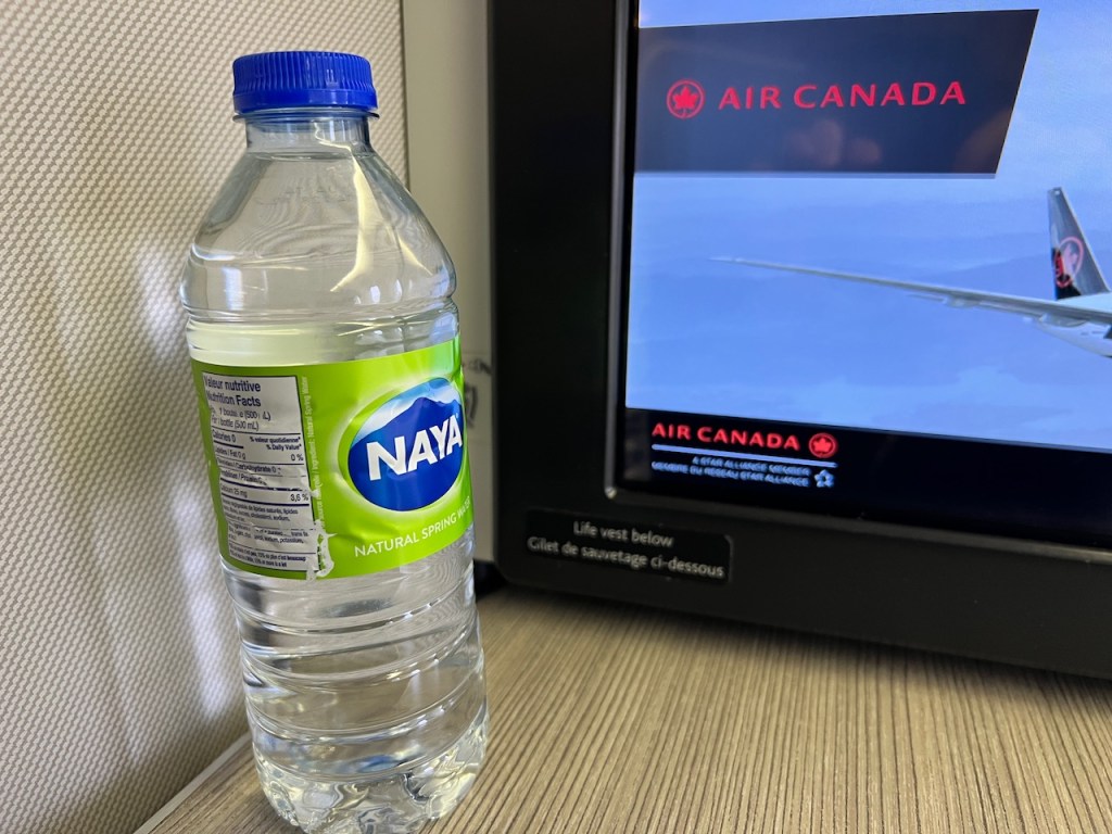 After settling into the seat, there was a bottle of Naya water waiting for me that served as the pre-departure beverage. Unlike most American carriers, there was no separate beverage service. Shortly afterwards, a flight attendant came around to drop off a printed menu.