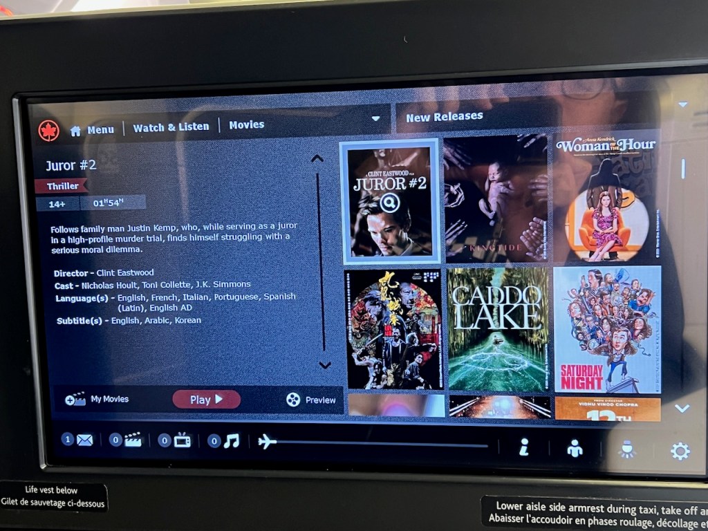 While I was enjoying the breakfast, I fooled around with the Air Canada En Route entertainment system. The entertainment system was presented on a large 18 inch screen. It features a moving flight map in addition to a number of movies.