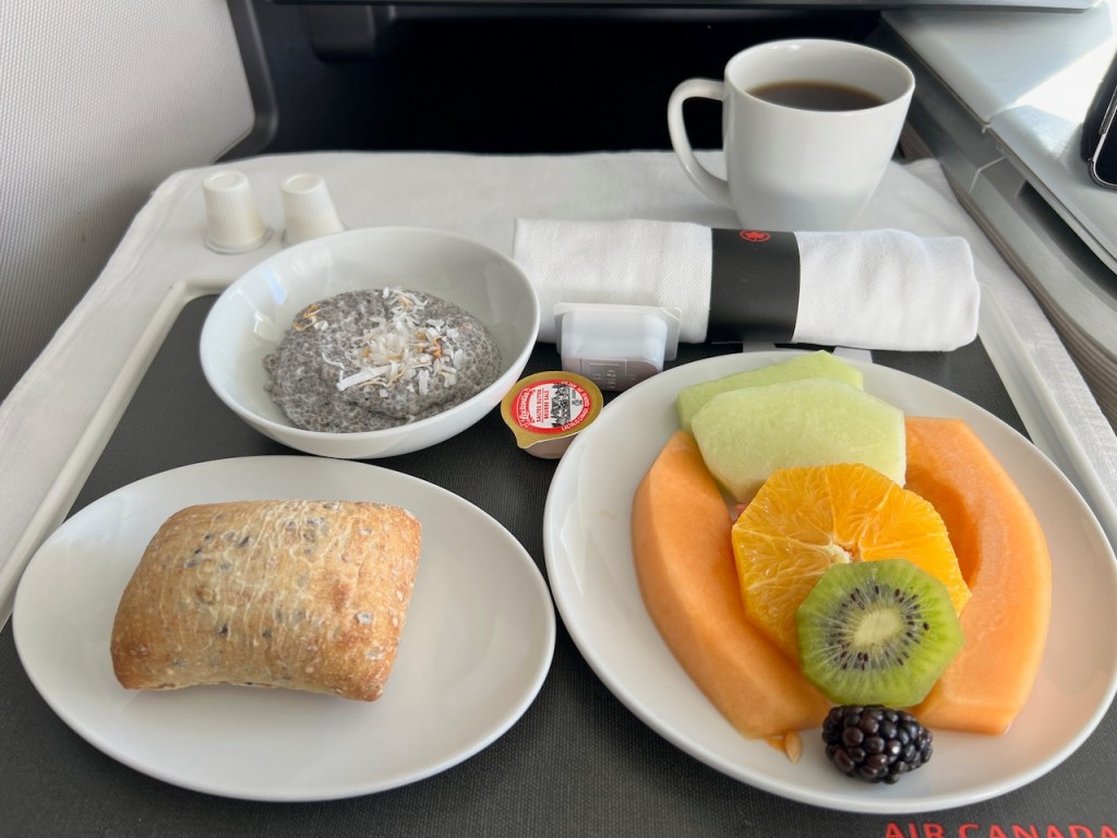 The meal service started with the usual towel service. The starter plate, fruit and chia seed pudding were delivered all at once, along with a coffee.