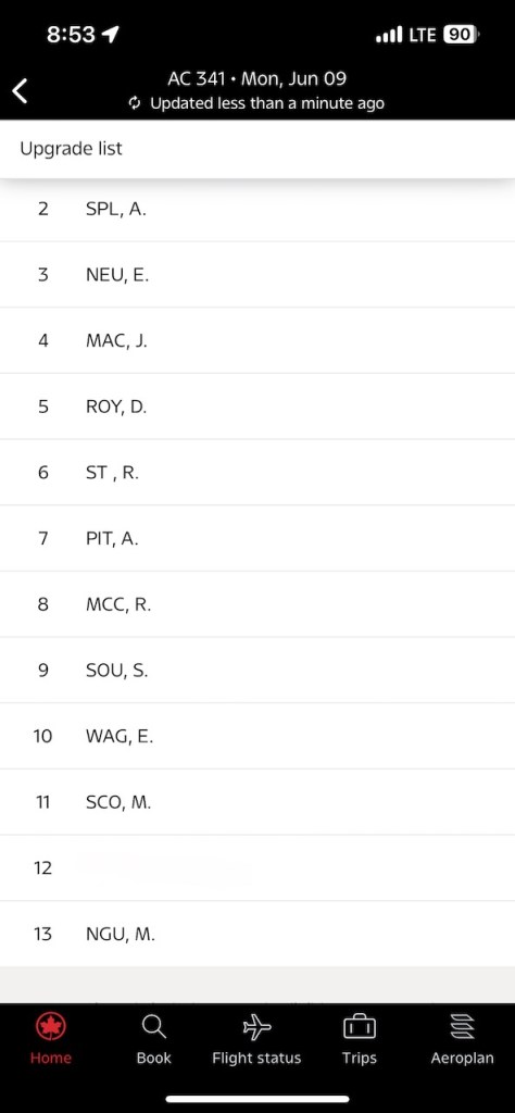 I regularly fly this route for work reasons. While I had listed for an upgrade using Air Canada Aeroplan E-Upgrade instruments, I wasn’t successful. Most recently, the trans continental upgrades are quite popular. I would end up being #12 on a list of more than twenty on this Monday morning.