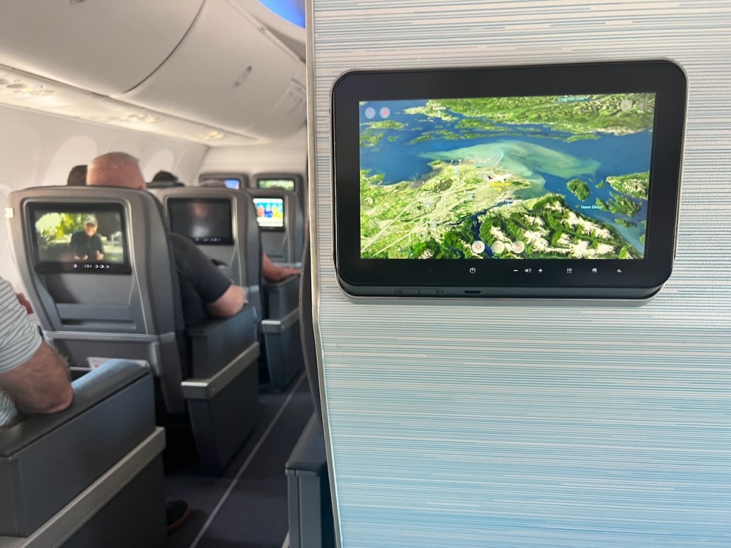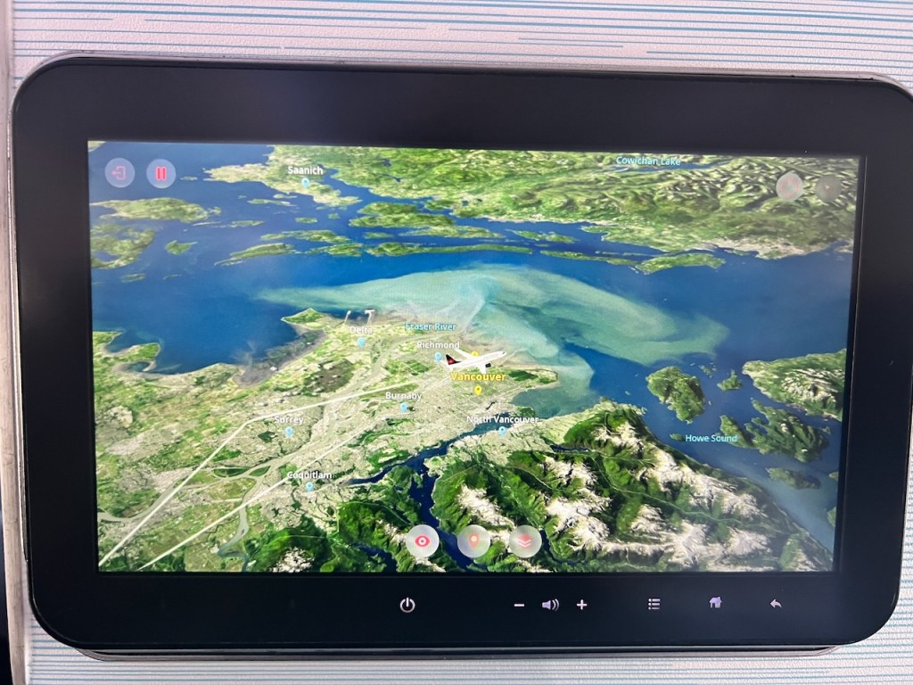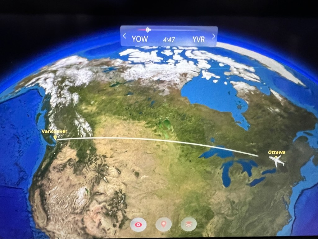 Each seat offered a setback monitor. I played around with the flight information to learn that today’s flight would be approximately four hours and forty seven minutes from Ottawa to Vancouver.