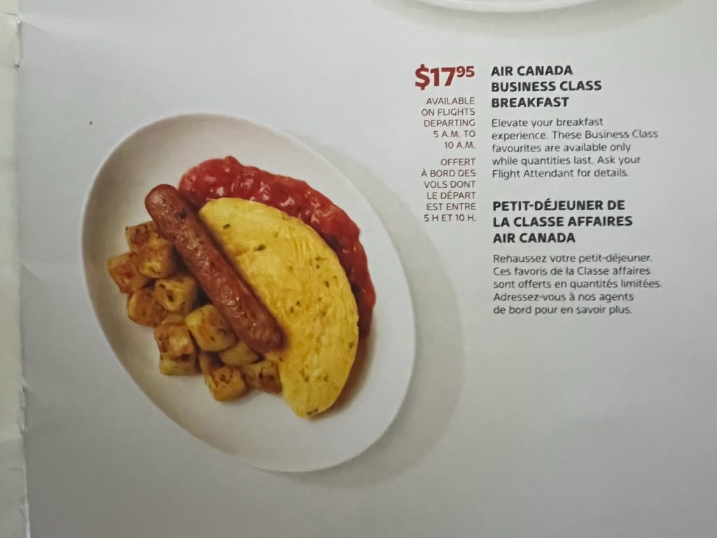 Air Canada offers a buy on board in flight meal service with various menu items. I don’t typically find the food offerings on Air Canada to be particularly worthy. I had a bit of a laugh that Air Canada sells the over used and tired Parsley Omelette for $17.95 CAD.