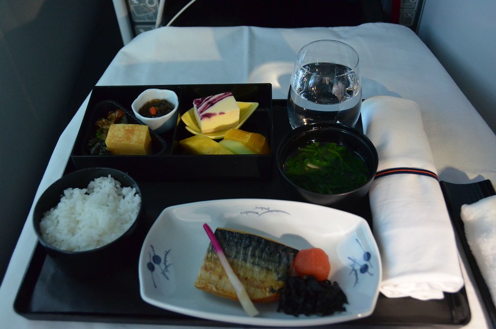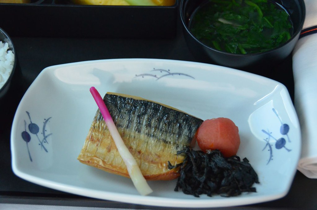 Shortly after waking up, the second meal service was presented. Again, I went with the Japanese Set. The Kuchidori- Mozuku seaweed in vinegar sauce with Japanese savoury omelet, presented with Shausai salt grilled mackerel, served with steamed rice, miso soup and assorted Japanese pickles.