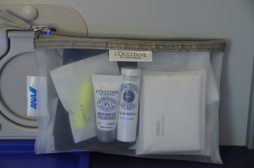 An amenity kit, blanket, sleeping pad, slippers were left on our seat. The amenity kit was a weak L’Occitane En Provence branded kit, but it did the trick.