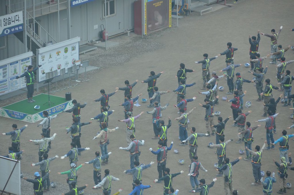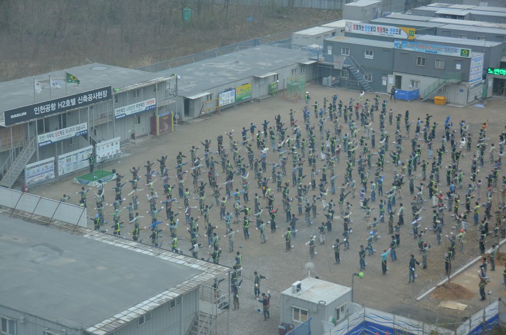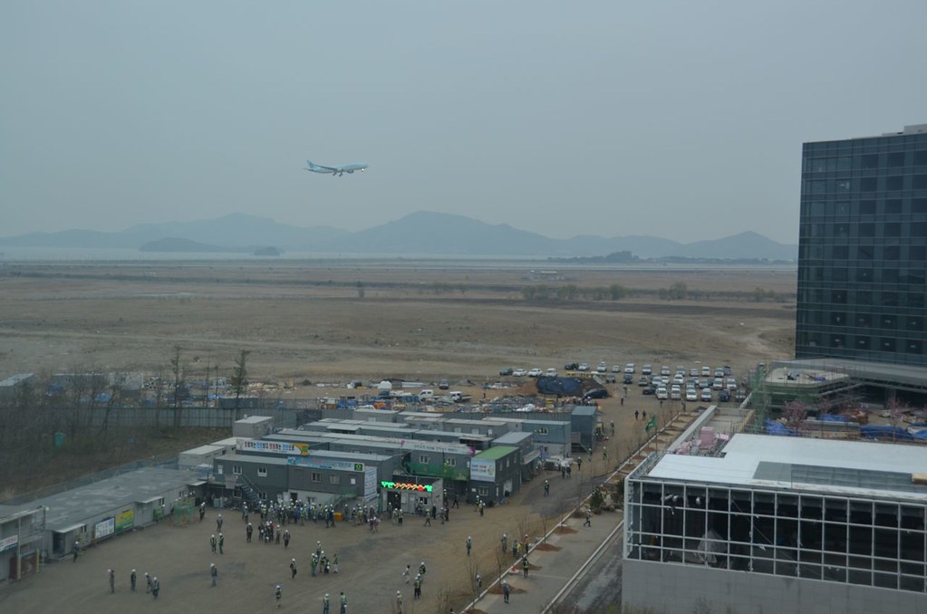The next morning, we had a nice view of the morning landing runway. We also had view of the morning calisthenics from the construction side for the project immediately next door at the 7 AM roll call. The exercises were a bit unusual from a North American business perspective, but probably common in some Asian countries.