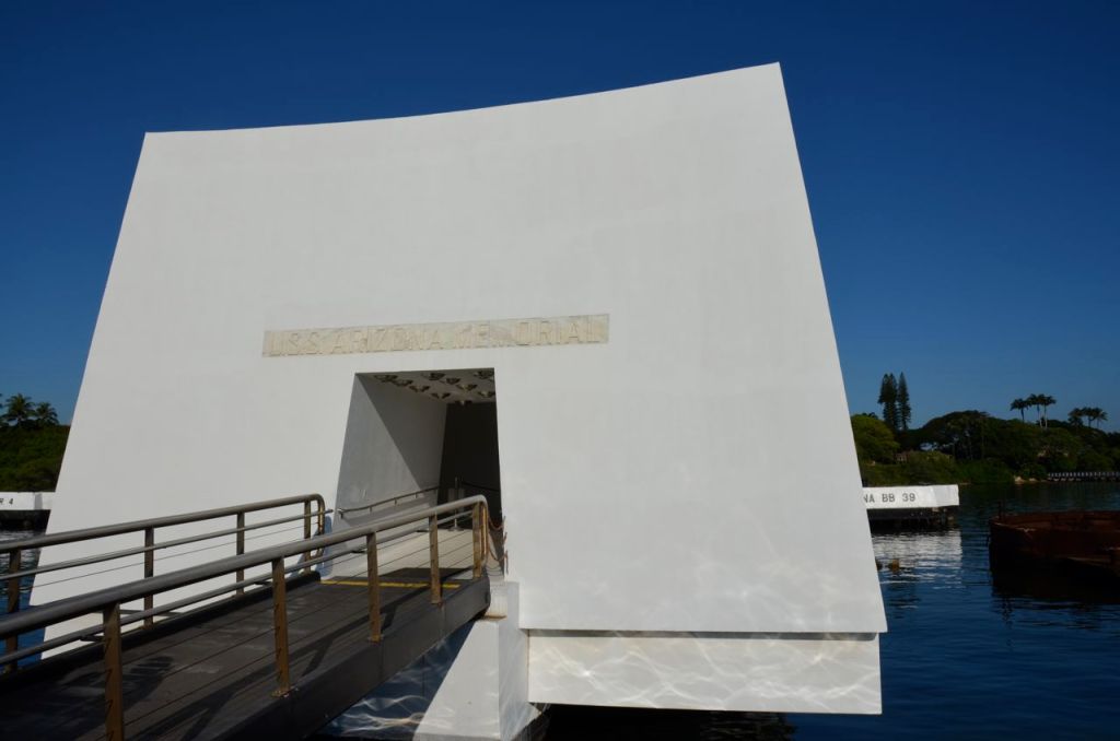 The structure straddles the frame of the USS Arizona battleship that sunk during the attack on Pearl Harbour.