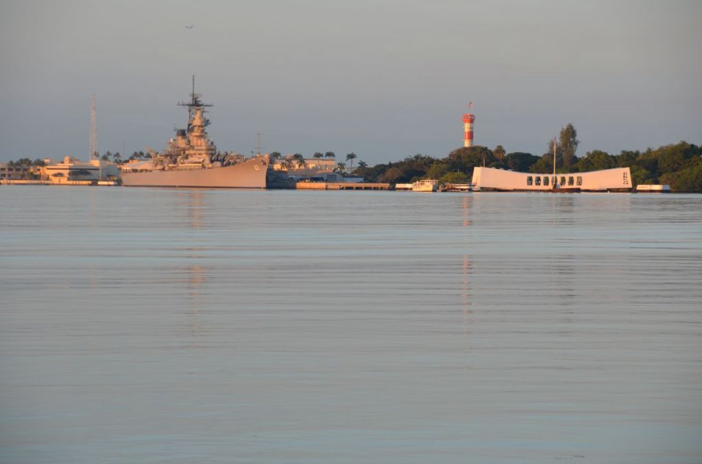 After being collected and a 30 minute drive, we arrived at the Pearl Harbour visitor center. I was pretty much in a tour of one person, so I was free to walk around on my own. I was able to get my first look at Pearl Harbour, which was a low harbour without many high or hilly features. The sun was just rising at around this time, leading to a very peaceful and tranquil setting. In the distance from the welcome center, one could see the USS Missouri and the USS Arizona Memorial.