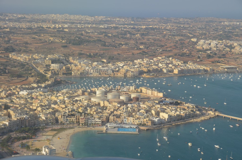 Since I was asleep, I missed most of the flight. I woke up to views of us approaching the island of Malta. We had nice landing approach with a flight path on the east side of the island. Being in seats 12EF we had a great view of the eastern coast of Malta on our way in.